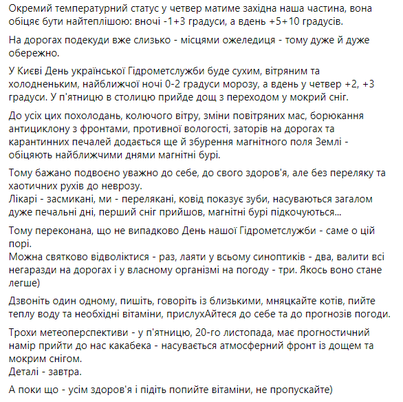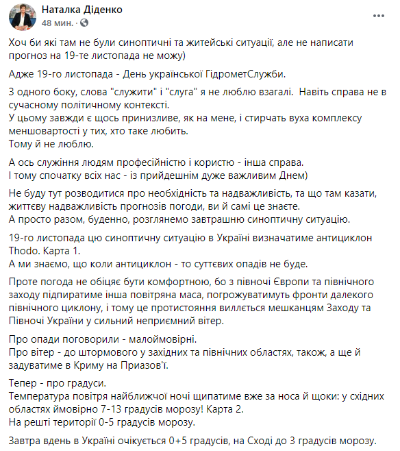 Об этом сообщает синоптик Наталья Диденко на своей странице в Facebook.