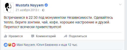 21 ноября журналист Мустафа Найем бросил в Facebook клич выходить на Майдан, что и стало формальным началом протестов.