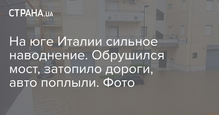 На юге Италии сильное наводнение. Обрушился мост, затопило дороги, авто поплыли. Фото