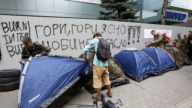 Сегодня, 5 сентября, в сгоревшем офисе телеканала "Интер" сотрудники пытаются навести элементарный порядок и заодно оценить нанесенный ущерб. В это время под их окнами уже который час разворачивается картина блокады. Здесь с утра толпятся радикально настроенные люди, которые угрожают блокировать здание, пока телеканал "Интер" не закроют.