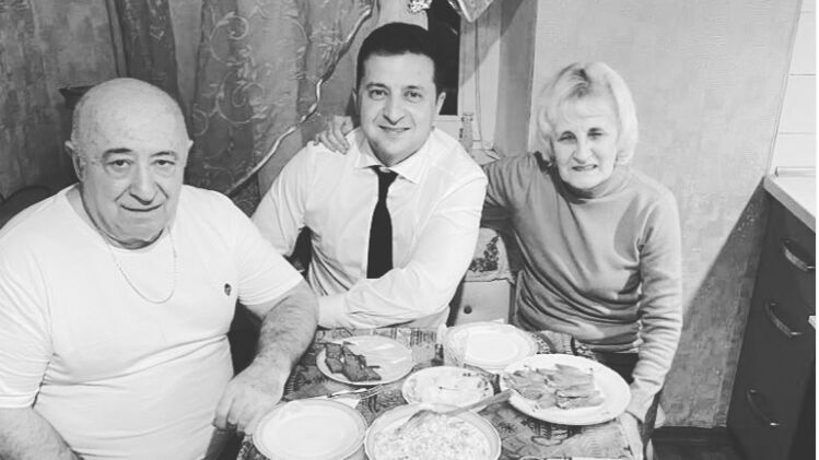 На снимке Зеленский сидит на тесной кухне вместе с Риммой Владимировной и Александром Семеновичем. Перед ними на столе стоят блюда с незамысловатой едой: салатом, сырной нарезкой, квашеной капустой и жареными куриными окороками. Также присутствуют стопки для спиртного, хотя бутылки не видно.