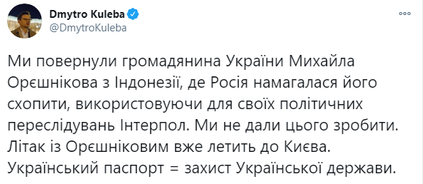 "Мы вернули гражданина Украины Михаила Орешникова из Индонезии, где Россия пыталась его схватить, используя для своих политических преследований Интерпол. Мы не дали этого сделать. Самолет с Орешниковим уже летит в Киев. Украинский паспорт = защита Украинского государства", - рассказал министр.
