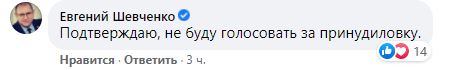 "Подтверждаю, не буду голосовать за принудиловку", - написал в комментариях автор первого альтернативного законопроекта Евгений Шевченко.