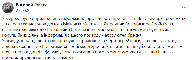 Учитывая же то, что позавчера были обнародованы очередные рейтинги, которые показывают, что доверие украинцев к Владимиру Гройсману росло последние полгода и составляет уже 31%, появление ложной информации, призванной его скомпрометировать - не что иное, как начало грязной политической кампании", - заявил спикер бывшего премьера Василий Рябчук.