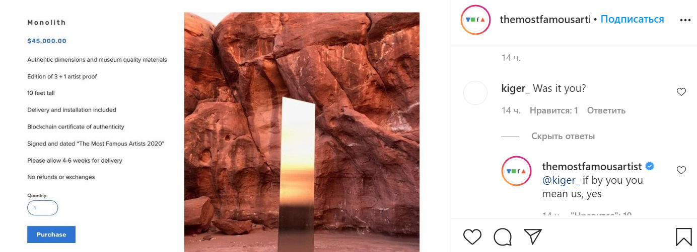 Тайна монолитов раскрыта. Скриншот https://www.instagram.com/themostfamousartist/