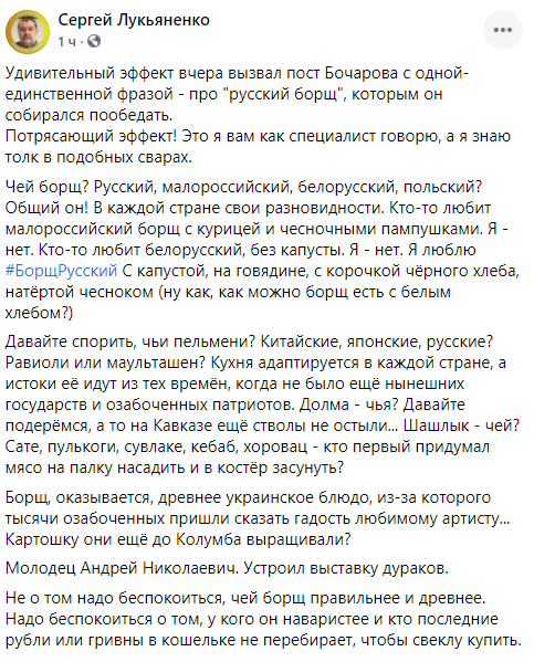 Россияне считают иначе, да и сам Бочаров практически под каждым комментарием оставляет хэштег #БорщРусский.