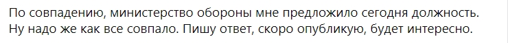 "По совпадению, министерство обороны мне предложило сегодня должность. Ну надо же как все совпало. Пишу ответ, скоро опубликую, будет интересно", - написал Бутусов у себя в Фейсбуке.