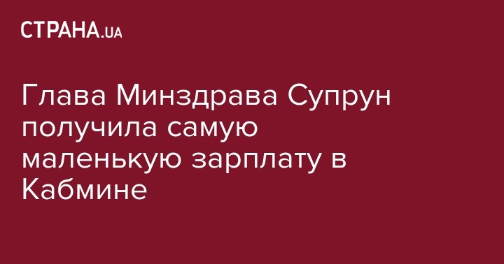 В Кабмине наименьшую заработную плату за август получила исполняющая обязанности министра здравоохранения Ульяна Супрун  - всего 6 640 гривны ($247). Об этом говорится в ответе Министерства здравоохранения на запрос "Украинских новостей".
