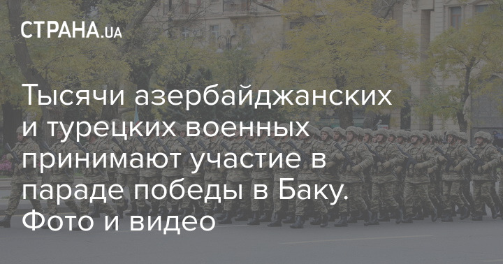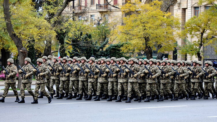В Баку, на площади Азадлыг, проходит парад победы, посвященный подписанию соглашения с Арменией и Россией касательно завершения военных действий в Карабахе и передаче части территорий региона Азербайджану. В мероприятии принимают участие тысячи азербайджанских и турецких военных.
