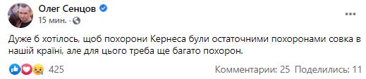 12:50 "Очень бы хотелось, чтобы похороны Кернеса были окончательными похоронами совка в нашей стране, но для этого надо еще много похорон" - написал Олег Сенцов.
