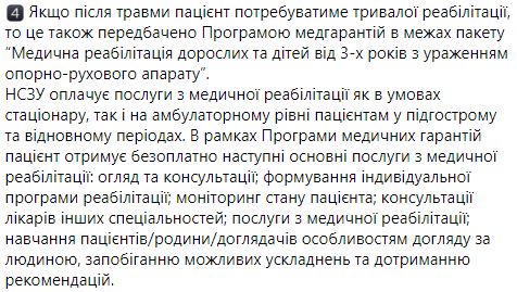 Кроме того, в НСЗУ рассказали, что если после травмы пациент будет нуждаться в длительной реабилитации, то это также предусмотрено Программой медгарантий в рамках пакета "Медицинская реабилитация взрослых и детей от 3-х лет с поражением опорно-двигательного аппарата".