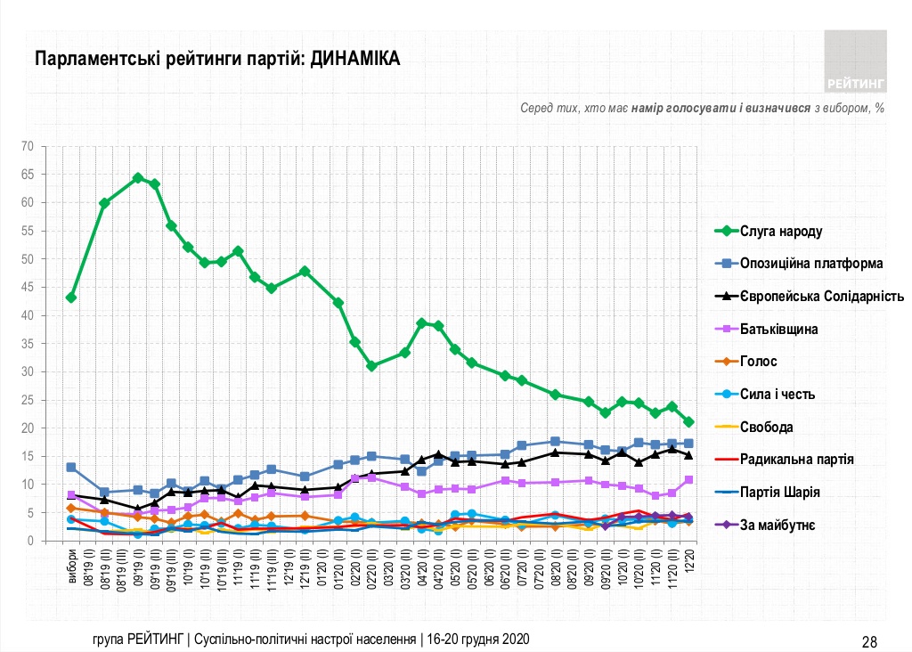 Наглядно показывает причины падения симпатиков Зеленского кривая его партии "Слуга народа". Ее рейтинг рухнул до 21%, и в затылок президентской политсиле дышит "Оппозиционная платформа" (17,3%).