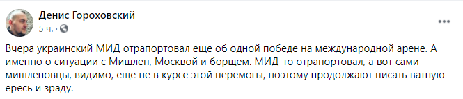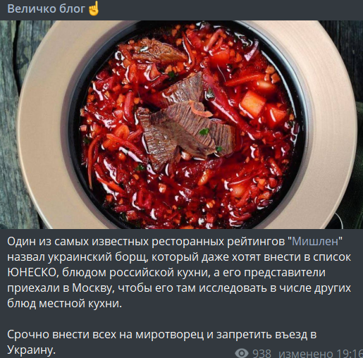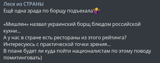 "Вчера украинский МИД отрапортовал еще об одной победе на международной арене. А именно о ситуации с Мишлен, Москвой и борщом. МИД-то отрапортовал, а вот сами мишленовцы, видимо, еще не в курсе этой перемоги, поэтому продолжают писать ватную ересь и зраду".