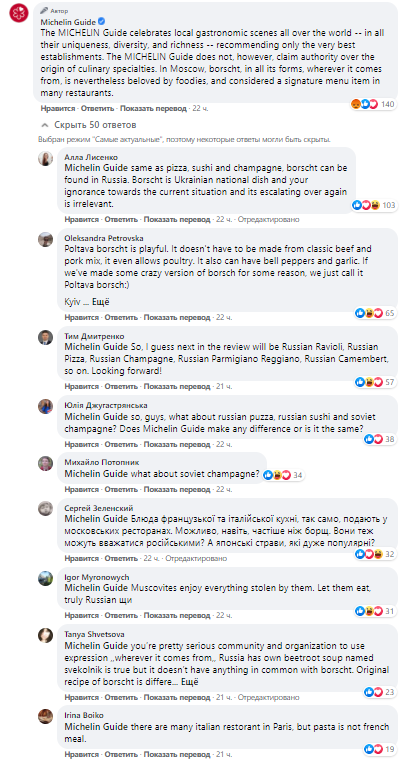 Реакция Michelin оказалась совсем не той, на которую рассчитывали адепты украинского борща, о чем говорят их раздраженные комментарии.