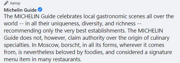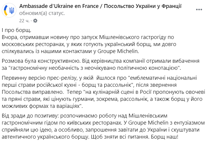 "И о борще. Вчера, получив новость о запуске мишленовского гастрогида по московским ресторанам, в которых готовят украинский борщ, мы долго общались с нашими контактами Groupe Michelin. Разговор был конструктивным. От руководства компании получили извинения за "гастрономическую неосторожность с неожиданно политической коннотацией".