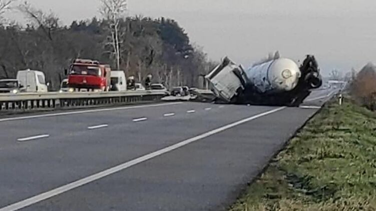 На трассе Киев - Харьков перевернулся грузовик, движение заблокировано