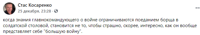 "Когда знания главнокомандующего о войне ограничиваются поеданием борща в солдатской столовой, становится не то чтобы страшно, скорее интересно, как он вообще представляет себе "большую войну", - пишет пользователь из Запорожья Стас Косаренко.