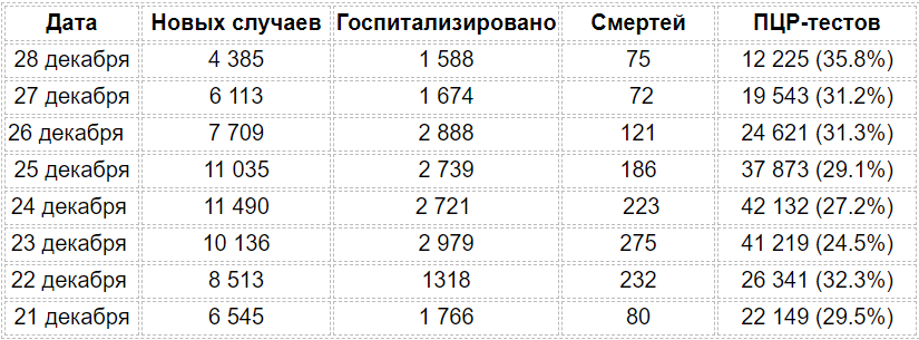 Число заболевших падает, даже несмотря на то что с 30 ноября уже не действует карантин выходного дня, а по ряду направлений смягчили другие ограничения. Например, разрешили ресторанам работать до 23:00, а народные гулянья у елок проходят без масок и дистанции.