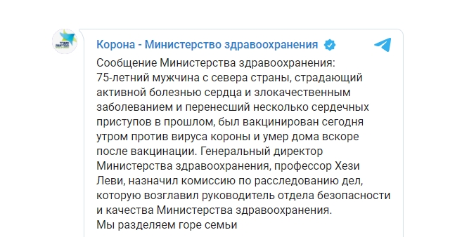 75-летний гражданин Израиля скончался от сердечного приступа спустя пару часов после вакцинации от Covid-19.