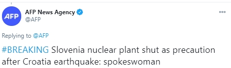 Кроме того власти Словении отключили в качестве меры предосторожности единственную действующую в стране АЭС "Кршко" после того, как на территории соседней Хорватии было зафиксировано землетрясение, сообщает "Агентство новостей АFP" в своем Twitter.