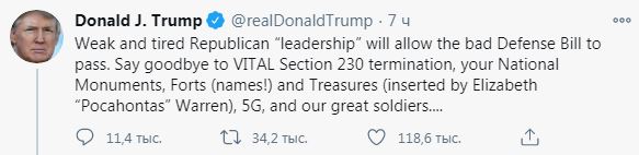"Слабое и усталое республиканское "руководство" (в Сенате США - Ред.) позволит пройти плохому законопроекту с оборонным бюджетом", - написал Трамп в серии сообщений.