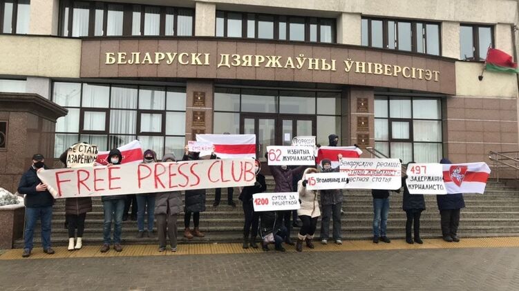 Также акция проходит около факультета журналистики Белорусского государственного университета в Минске. Протестующие таким образом выразили поддержку задержанным журналистам.