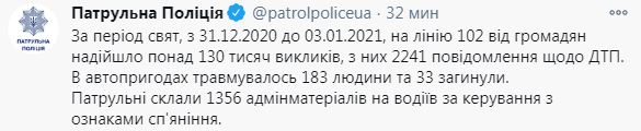 "За период праздников, с 31.12.2020 до 03.01.2021, на линию 102 от граждан поступило более 130 тысяч вызовов, из них 2241 сообщения о ДТП. В авариях травмировались 183 человека и 33 погибли", - говорится в сообщении.
