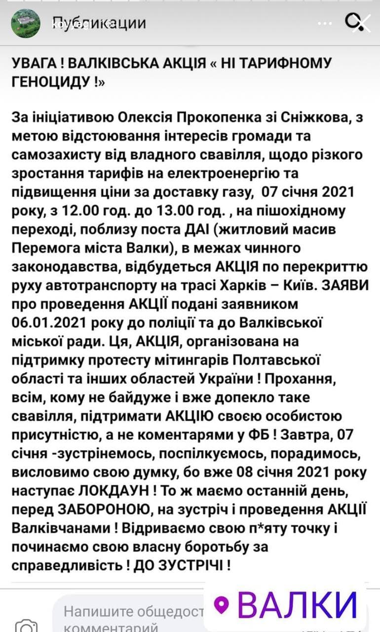 В четверг, 7 января, в городе Валки Харьковской области активисты перекрыли трассу Харьков-Киев. Они провели акцию протеста в связи с увеличением тарифов на газоснабжение в поддержку жителей Полтавской области, которые также тремя днями ранее перекрывали дорогу.