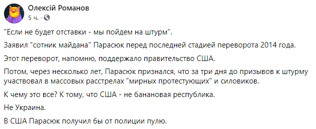 К чему это все? К тому, что США – не банановая республика. Не Украина. В США Парасюк получил бы от полиции пулю", – пишет журналист Алексей Романов.