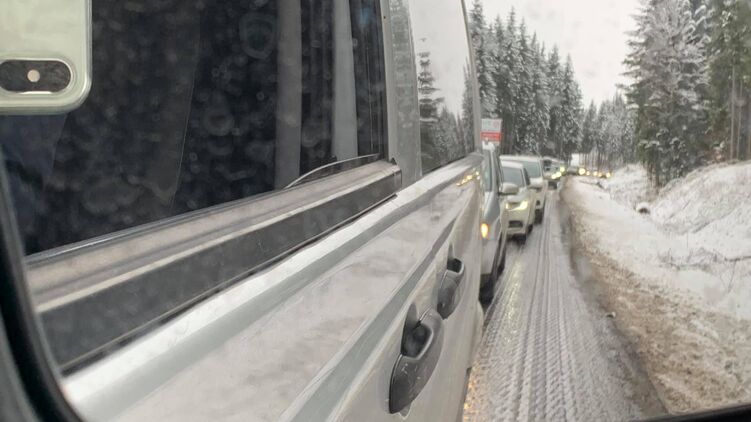 Появились фото километровой пробки по дороге в Буковель в первый день локдауна