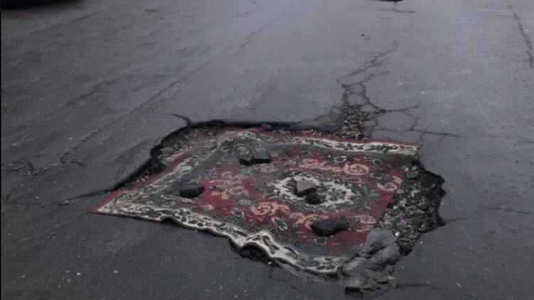 В Черкассах вместо ремонтных работ яму на дороге решили залатать с помощью расписного ковра.