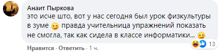 Также пользователи пишут об удивительных уроках физкультуры, которые проходят в зуме. "Правда учительница упражнений показать не смогла, так как сидела в классе информатики", - рассказала Анаит Пыркова.