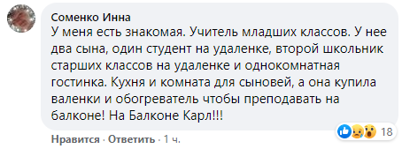 "У меня есть знакомая. Учитель младших классов. У нее два сына, один студент на удаленке, второй школьник старших классов на удаленке и однокомнатная гостинка. Кухня и комната для сыновей, а она купила валенки и обогреватель чтобы преподавать на балконе! На Балконе Карл!", - пересказала историю своей знакомой женщина.