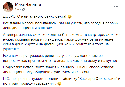 Подсказки: используйте туалет и ванную... Очень способствуют дистанционному общению с учителем и классом", - написал он в Фейсбуке.