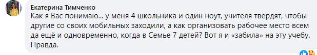 "У меня 4 школьника и один ноут, учителя твердят, чтобы другие со своих мобильных заходили, а как организовать рабочее место всем да ещё и одновременно, когда в Семье 7 детей? Вот я и "забила" на эту учебу. Правда".
