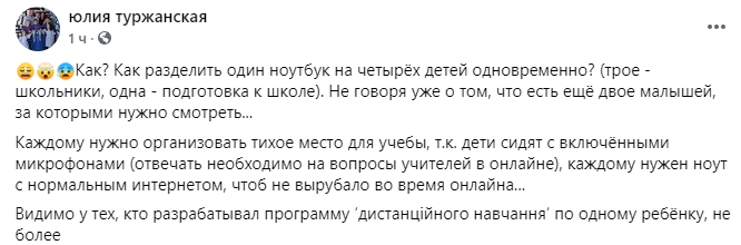 Видимо, у тех, кто разрабатывал программу ‘дистанційного навчання‘, по одному ребёнку, не более", - пишет  подписчица группы "Батьки SOS" Юлия Туржанская.