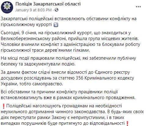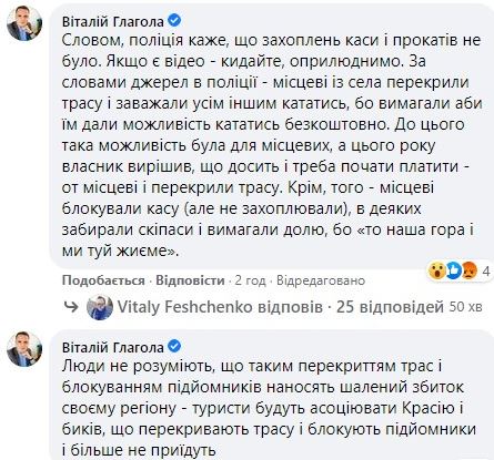 Кроме того - местные блокировали кассу (но не захватывали), у некоторых забирали скипасы и требовали долю, потому что "это наша гора и мы туй жиемо", - пишет журналист Виталий Глагола в комментариях под постом полиции.