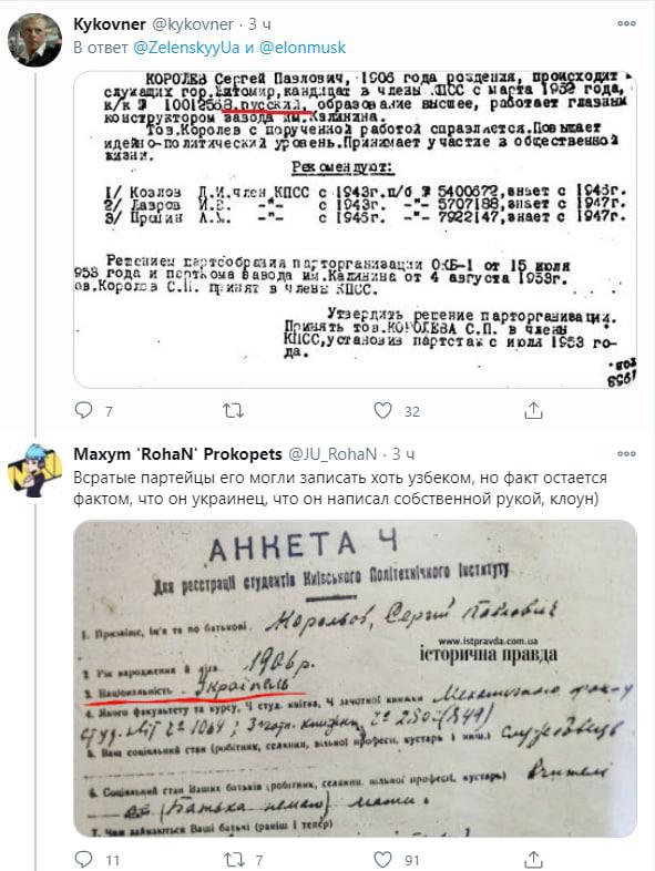 Через полчаса в тред пришёл Илон Маск, где написал, что Королёв "был великолепен". В Твиттере тут же произошёл фейерверк пуканов политических украинцев, которые, разумеется, сразу напомнили, что Королёв был украинец, и вообще.