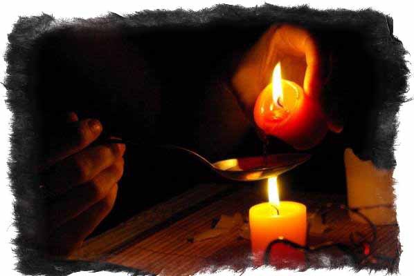 Это гадание важно проводить в одиночестве. Обряд предполагает наличие миски с холодной водой (талой или освященной), свечи и ложки. Расплавленный воск свечи нужно собрать в чайную ложку, после чего вылить в воду по кругу или "как рука возьмет". Дальше играет ваше воображение - по получившейся фигурке девушка узнает о том, что ее ожидает в скором времени.