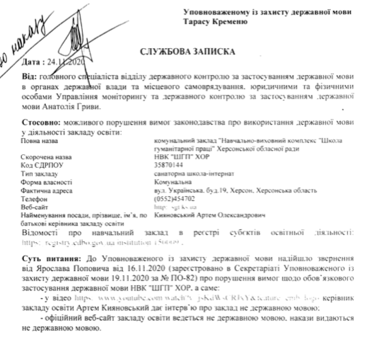 В служебной записке языкового омбудсмена говорится, что директор школы давал интервью не на государственном языке. Скриншот документа