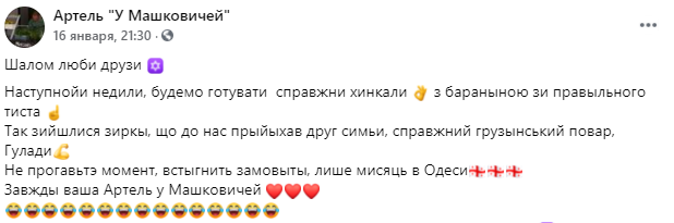 В субботу кулинария под названием "Артель "У Машковичей" опубликовала в Фейсбуке рекламу о доставке хинкали.