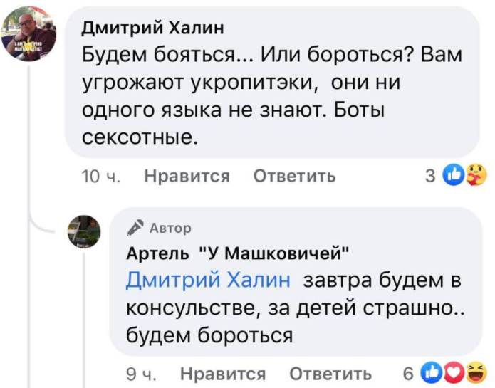 Отвечая одному из своих сторонников, владельцы "Артели" заявили, что им страшно за детей, которым тоже угрожают.