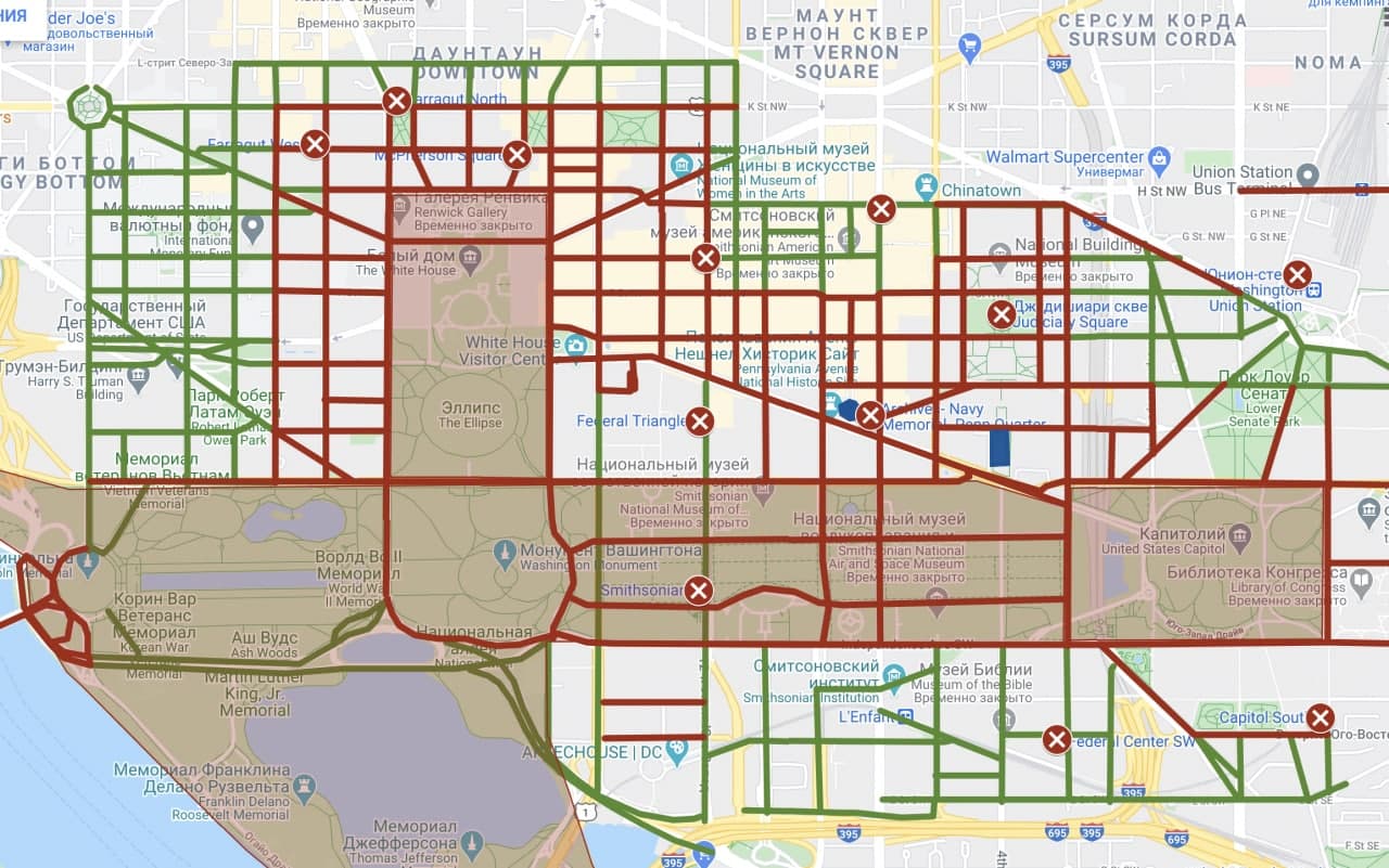 Есть и более красноречивая карта. Полностью заблокирован Белый дом, Капитолий, все подходы к ним и центр Вашингтона.