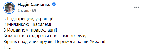 "Пусть Господь подарит вашим сердцам теплую надежду и чистые, как крещенская вода, мысли", - написал он у себя в Фейсбуке.