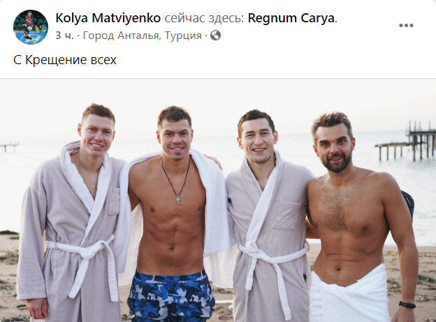 Из турецкой Антальи поздравляет всех с Крещением и публикует соответствующее фото. Справа от него - голкипер Алексей Шевченко и полузащитник Тарас Степаненко.
