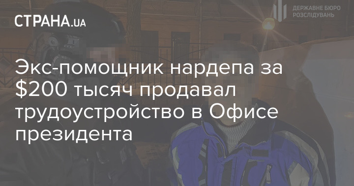 Государственное бюро расследований (ГБР) задержало бывшего помощника народного депутата, который обманом пытался получить 200 тысяч долларов за якобы помощь в трудоустройстве в Офис президента.