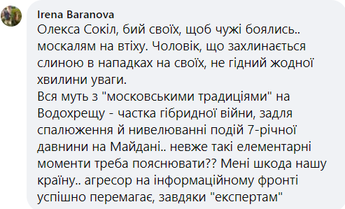 Еще одна пользовательница в комментариях уверяет, что "московские традиции на Крещение" - доля гибридной войны и нивелирование событий на Майдане 7 лет назад.