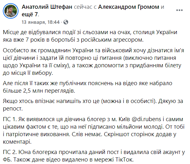 "Место, где происходили события со слезами на глазах, столица Украины, которая уже 7 лет борется с российским агрессором. Как гражданин Украины и военный хочу узнать имя этой девочки и задать ей повторно эти вопросы (исключительно касающиеся Украины и ее смеха), а также помочь с приобретением билета до места ее выбора", - написал Штефан и почему-то опубликовал обрезанный ролик, который к тому моменту уже был удален блогерами.