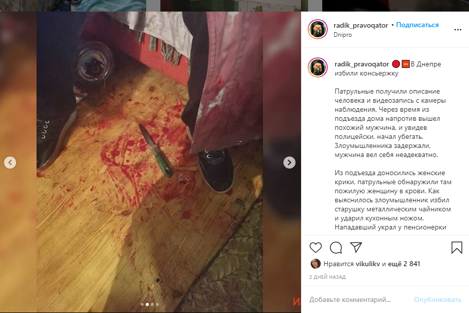 Позже из подъезда правоохранители услышали крики, а затем обнаружили там окровавленную 70-летнюю женщину. Выяснилось, что фигурант ворвался домой к консьержке, схватил чайник и начал бить им хозяйку по голове, после чего душил ее и бил в спину ножом. Не найдя никаких ценностей у потерпевшей, фигурант забрал 70 гривен и собирался уходить, но его вовремя заметили сотрудники полиции.