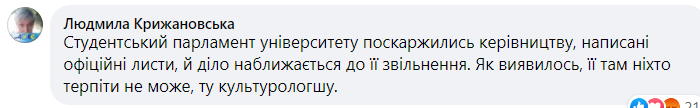 "Неуважаемые господа экстремисты, неонацисты и прочие хулиганские комментаторы! Только что беседовала с ректором НПУ Виктором Петровичем Андрущенко. Очевидно, что он находится под давлением. Но! Я получила от него заверение, что он несёт ответственность за свои слова и что он ЛИЧНО меня увольнять не собирается. Это запомните хорошенько, трижды выбейте у себя на подкорке и между всеми молекулярными составляющими мозга. По словам ректора, увольнять за политические взгляды из университета - не его практика.